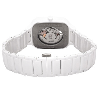 White high-tech ceramic case and bracelet. Fixed white high-tech ceramic bezel. White dial with rose gold-tone hands and index hour markers. Minute markers around the outer rim. Dial Type: Analog. Luminescent hands and markers. Rado Calibre 808 automatic movement with an 80-hour power reserve. Scratch resistant sapphire crystal. Pull / push crown. Transparent case back. Square case shape, case size: 38 mm, case thickness: 9.7 mm. Fold over clasp with a safety release. Water resistant at 50 meters / 165 feet. Functions: hour, minute, second. True Square Series. Luxury watch style. Watch label: Swiss Made. Rado True Square Automatic Skeleton White Dial Unisex Watch R27126012.
