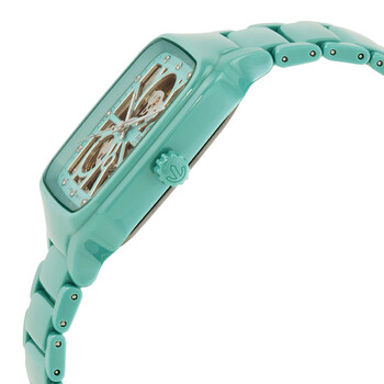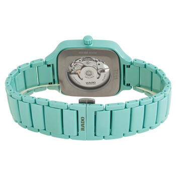 Turquoise ceramic case and bracelet. Fixed turquoise ceramic bezel. Turquoise dial with silver-tone hands and diamond hour markers. Dial Type: Analog. Rado Calibre 734 automatic movement with an 80-hour power reserve. Scratch resistant sapphire crystal. Pull / push crown. Transparent case back. Square case shape, case size: 38 mm, case thickness: 9.7 mm. Deployment clasp. Water resistant at 50 meters / 165 feet. Functions: hour, minute, second. True Square Series. Dress watch style. Watch label: Swiss Made. Item Variations: 01.734.6176.3.071. Rado True Square Open Heart Automatic Diamond Unisex Watch R27176712.