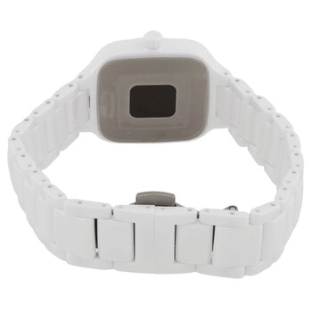 White high-tech ceramic and titanium case and bracelet. Fixed white high-tech ceramic bezel. White dial with gold-tone hands and index hour markers. Minute markers around the outer rim. Dial Type: Analog. Luminescent hands and markers. Date display at the 6 o'clock position. Quartz movement. Scratch resistant sapphire crystal. Pull / push crown. Solid case back. Square case shape, case size: 29.2 mm, case thickness: 8.1 mm. Butterfly clasp. Water resistant at 50 meters / 165 feet. Functions: date, hour, minute, second. True Square Series. Sport watch style. Watch label: Swiss Made. Rado True Square Quartz White Dial Ladies Watch R27072012.