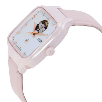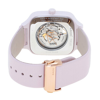 Pink ceramic case with a pink leather strap. Fixed pink ceramic bezel. White mother of pearl dial with rose gold-tone hands and index hour markers. Minute markers around the outer rim. Dial Type: Analog. Luminescent hands and markers. Automatic movement with an 80-hour power reserve. Scratch resistant sapphire crystal. Pull / push crown. Transparent case back. Square case shape, case size: 38 mm, case thickness: 9.7 mm. Folding buckle clasp. Water resistant at 50 meters / 165 feet. Functions: hour, minute, second. Additional Info: limited edition: 996 pieces. True Square X Ash Barty Limited Edition Series. Casual watch style. Watch label: Swiss Made. Rado True Square x Ash Barty Limited Edition Automatic White Mother of Pearl Dial Ladies Watch R27123905.