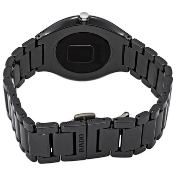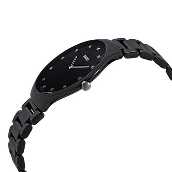 Black high-tech ceramic case with a black high-tech ceramic bracelet. Fixed bezel. Black dial with silver-tone hands and 12 diamond hour markers. Dial Type: Analog. Quartz movement. Scratch resistant sapphire crystal. Case diameter: 39 mm. Round case shape. Deployment clasp. Water resistant at 30 meters / 100 feet. Functions: hour, minute, second. Dress watch style. Rado True Thinline Black High-tech Ceramic Diamond Markers 39 mm Watch R27741732.