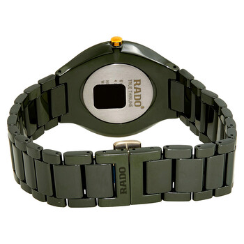 Green high-tech ceramic case with a green (high-tech) ceramic bracelet. Fixed green high-tech ceramic bezel. Green mother of pearl dial with gold-tone hands and index hour markers. Dial Type: Analog. Quartz movement. Scratch resistant sapphire crystal. Pull / push crown. Solid case back. Round case shape, case size: 39 mm, case thickness: 5 mm. Butterfly clasp. Water resistant at 30 meters / 100 feet. Functions: hour, minute. True Thinline Series. Casual watch style. Watch label: Swiss Made. Item Variations: 01.420.0006.3.091, 01-420-0006-3-091, 01.420.0006.3.091. Rado True Thinline Green Mother of Pearl Dail Men's Watch R27006912.