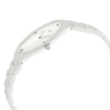 White (hi-tech) ceramic case with a white (hi-tech) ceramic bracelet. Fixed white (hi-tech) ceramic bezel. Mother of pearl dial with silver-tone hands. Diamond markers at the 3, 6, 9 and 12 o'clock positions. Dial Type: Analog. Rado calibre 140 quartz movement. Scratch resistant sapphire crystal. Pull / push crown. Solid case back. Round case shape. Case size: 39 mm. Case thickness: 5 mm. Band width: 20 mm. Fold over clasp with a push button release. Water resistant at 30 meters / 100 feet. Functions: hour, minute. True Thinline Series. Dress watch style. Watch label: Swiss Made. Rado True Thinline Mother of Pearl Dial White Ceramic Men's Watch R27957902.