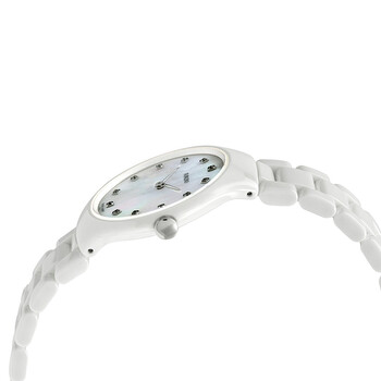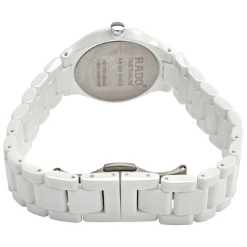 White (high tech) ceramic case and bracelet. Fixed white (high tech) ceramic bezel. Mother of pearl dial with silver-tone skeleton hands and diamond hour markers. Dial Type: Analog. ETA caliber 282.001 quartz movement. Scratch resistant sapphire crystal. Pull / push crown. Solid case back. Round case shape. Case size: 30 mm. Case thickness: 4.9 mm. Band width: 16 mm. Fold over clasp with a push button release. Water resistant at 30 meters / 100 feet. Functions: hour, minute. Dress watch style. Watch label: Swiss Made. Rado True Thinline Mother of Pearl Diamond Dial Ladies Watch R27958912.