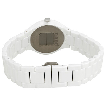 White high-tech ceramic case and bracelet. Fixed white high-tech ceramic bezel. White dial with silver-tone hands. No markers. Dial Type: Analog. Rado Calibre 420 quartz movement. Scratch resistant sapphire crystal. Pull / push crown. Solid case back. Round case shape. Case size: 30 mm. Case thickness: 4.9 mm. Fold over clasp. Water resistant at 30 meters / 100 feet. Functions: hour, minute. Dress watch style. Watch label: Swiss Made. Rado True Thinline White Dial White Ceramic Ladies Watch R27958022.