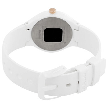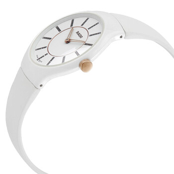 White (high tech) ceramic case with a white rubber strap. Fixed white (high tech) ceramic bezel. White dial with rose gold-tone skeleton hands and diamond-filled index hour markers. Dial Type: Analog. Rado calibre 420 quartz movement. Scratch resistant sapphire crystal. Pull / push crown. Solid case back. Round case shape. Case size: 30 mm. Case thickness: 5 mm. Band width: 15 mm. Tang clasp. Water resistant at 30 meters / 100 feet. Functions: hours, minutes. True Series. Dress watch style. Watch label: Swiss Made. Rado True Thinline White Diamond Dial Rubber Rubber Ladies Watch R27958709.
