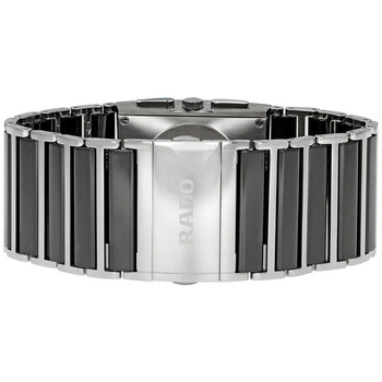 Black ceramic case with a two-tone (silver-tone and gold-tone) black ceramic with stainless steel trim bracelet. Fixed two-tone (silver-tone and gold-tone) ceramic bezel. Black dial with silver-tone hands and stick hour markers. Minute markers around the outer rim. the rado name appears at the 12 o'clock position. Dial Type: Analog. Luminescent hands. Date display at the 6 o'clock position. Chronograph - three sub-dials displaying: 60 seconds, 30 minutes and 1/10th of a second. Rado Calibre 538 quartz movement. Scratch resistant sapphire crystal. Pull / push crown. Solid case back. Rectangle case shape, case size: 38.2 mm x 31.0 mm, case thickness: 10.8 mm. Fold over with push button release clasp. Water resistant at 30 meters / 100 feet. Functions: chronograph, date, hour, minute, second. Dress watch style. Watch label: Swiss Made. Rado XL Integral Chronograph Men's Watch R20849152.
