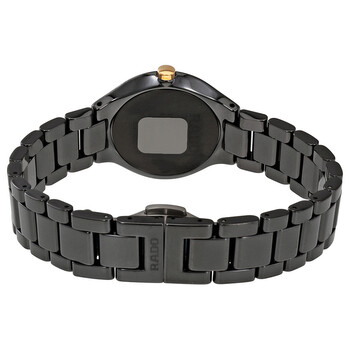 Black (high-tech) ceramic case and bracelet. Fixed black (high-tech) ceramic bezel. Black dial with rose gold-tone hands and diamond-set index hour markers. Dial Type: Analog. Rado calibre 420 quartz movement. Scratch resistant sapphire crystal. Pull / push crown. Solid case back. Round case shape. Case size: 30 mm. Case thickness: 5 mm. Band width: 16 mm. Fold over clasp with a push button release. Water resistant at 30 meters / 100 feet. Functions: hour, minute. True Series. Dress watch style. Watch label: Swiss Made. RadoTrue Black Dial Diamond Markers Ladies Ceramic Watch R27742702.