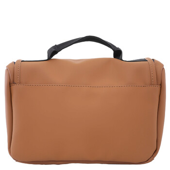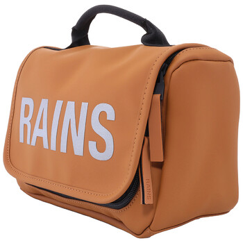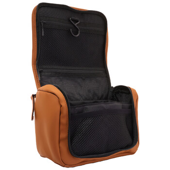 Rains Men's Cosmetic Case. SKU: 16310-RUST. Barcode: 5711747582845. Color: Rust. Rains Men's Rust Texel Wash Bag. This item is crafted from Rains’ signature waterproof PU fabric, offering both durability and water resistance. It features a folded cover that houses two zip pockets and a fold-out hanger for convenience. The bag also includes a padded carry handle for comfortable transport, a main compartment with two slip pockets, and an elastic storage band to securely hold small travel bottles, making it both functional and stylish for travel. 100% PES (Polyester).