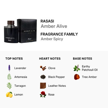 Amber Alive is part of the Amber Spicy fragrance family, making it an ideal choice for those who seek a scent that is both warm and invigorating. The top notes of Lavender, Artemesia, Tarragon, Lemon, and Pine create a refreshing and aromatic opening that instantly captivates the senses. As the fragrance evolves, the heart notes of Clove, Black Pepper, Leather, Rose, and Geranium add a spicy and floral complexity that is both bold and elegant.