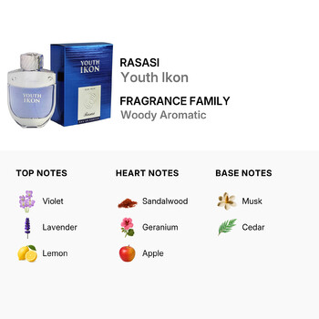 Rasasi Youth Ikon belongs to the Woody Aromatic fragrance family. The top notes of Violet, Lavender, and Lemon offer a fresh and invigorating start. As the scent develops, heart notes of Sandalwood, Geranium, and Apple add a sophisticated and balanced touch. Finally, the base notes of Musk and Cedar provide a warm, lasting finish that stays with you throughout the day.