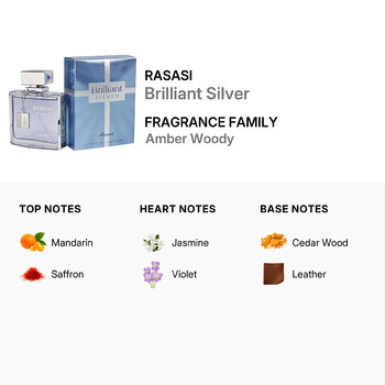 Brilliant Silver opens with invigorating top notes of mandarin and saffron, creating a refreshing and spicy introduction that captures attention. As the scent unfolds, heart notes of jasmine and violet blossom, adding a floral yet masculine touch that is both alluring and dynamic. Finally, the fragrance settles into a warm and earthy base of cedar wood and leather, leaving a memorable and enduring impression.