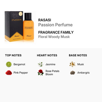 Rasasi Passion Perfume belongs to the Floral Woody Musk family, offering a harmonious blend of notes that create a truly unforgettable experience. The fragrance opens with the invigorating top notes of Bergamot and Pink Pepper, infusing a fresh and spicy allure right from the start.