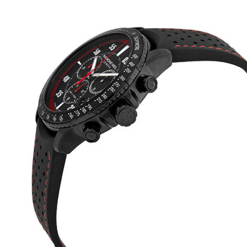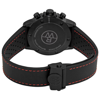 Black-plated stainless steel case with a black rubber strap. Fixed black-plated bezel showing tachymeter markings. Black dial with luminous silver-tone hands and Arabic numeral hour markers. Arabic numeral minute markers (at 5 minute intervals). Minute markers around the outer rim. Dial Type: Analog. Luminescent hands and markers. Date display between the 4 and 5 o'clock positions. Chronograph - three sub-dials displaying: 60 second, 30 minute and 12 hour. Quartz movement. Scratch resistant sapphire crystal. Screw down crown. Solid case back. Round case shape. Case size: 43 mm. Tang clasp. Water resistant at 300 meters / 1000 feet. Functions: chronograph, tachymeter, date, hour, minute, second. 300 Series. Sport watch style. Watch label: Swiss Made. Raymond Weil 300 Chronograph Quartz Black Dial Men's Watch 8570 -BKR-05240.