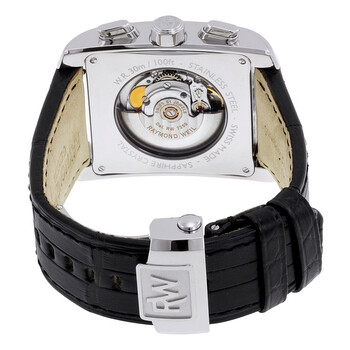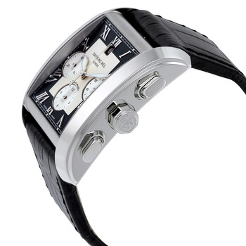 Silver-tone stainless steel case with a black alligator leather strap. Fixed silver-tone stainless steel bezel. Black dial with luminmous hands and Roman numeral hour markers. Minute markers around the outer rim. Dial Type: Analog. Luminescent hands and markers. Date display at the 12 o'clock position. Chronograph - three sub-dials displaying: 60 seconds, 30 minutes and 12 hours. Raymond Weil Calibre RW 7250 Automatic movement, based upon ETA 7750, containing 51 Jewels, bitting at 28800 vph, and has a power reserve of approximately 42 hours. Scratch resistant sapphire crystal. Pull / push crown. Skeleton case back. Rectangle case shape, case size: 50 mm x 37.6 mm, case thickness: 13 mm. Band width: 28 mm, band length: 7.5 inches. Deployment clasp. Water resistant at 30 meters / 100 feet. Functions: chronograph, date, hour, minute, second. Don Giovanni Series. Dress watch style. Watch label: Swiss Made. Item Variations: 4878 STC 00268, 4878.STC.00268, 4878STC00268. Raymond Weil Don Giovanni Cosi Grande Men's Watch 4878-STC-00268.