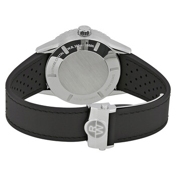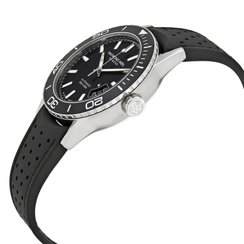 Stainless steel case with a black perforated rubber strap. Uni-directional rotating stainless steel bezel with a black ceramic ring. Black dial with luminous silver-tone hands and index hour markers. Minute markers around the outer rim. Dial Type: Analog. Luminescent hands and markers. Date display at the 4 o'clock position. Automatic movement with a 38-hour power reserve. Scratch resistant sapphire crystal. Screw down crown. Solid case back. Round case shape. Case size: 42.5 mm. Case thickness: 11.8 mm. Band width: 25 mm. Deployment clasp with a push button release. Water resistant at 300 meters / 1000 feet. Functions: date, hour, minute, second. Freelancer Series. Dive watch style. Watch label: Swiss Made. Raymond Weil Freelancer Automatic Black Dial Men's Watch 2760-SR1-20001.