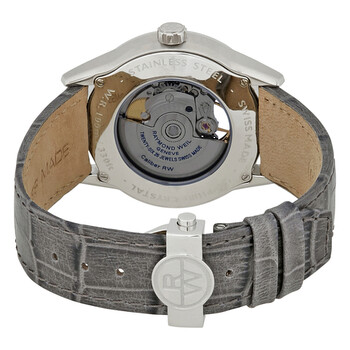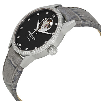 Stainless steel case with a grey (alligator) leather strap. Fixed stainless steel set with diamonds bezel. Black (skeletal window) dial with luminous silver-tone hands and diamond hour markers. Dial Type: Analog. Luminescent hands. Automatic movement with a 38-hour power reserve. Scratch resistant anti-reflective sapphire crystal. Pull / push crown. Transparent case back. Round case shape. Case size: 38 mm. Case thickness: 9.65 mm. Band width: 20 mm. Fold over clasp with a push button release. Water resistant at 100 meters / 330 feet. Functions: hour, minute, second. Luxury watch style. Watch label: Swiss Made. Item Variations: 2750 SLS 20081, 2750.SLS.20081, 2750SLS20081. Raymond Weil Freelancer Automatic Black Diamond Dial Ladies Watch 2750-SLS-20081.