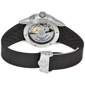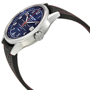 Stainless steel case with a black rubber strap. Fixed stainless steel bezel. Blue dial with luminous silver-tone hands and Arabic numeral hour markers. Minute markers around the outer rim. Dial Type: Analog. Luminescent hands. Date display at the 3 o'clock position. Automatic movement with a 38-hour power reserve. Scratch resistant sapphire crystal. Screw down crown. Transparent case back. Case size: 42.5 mm. Case thickness: 10.3 mm. Round case shape. Band width: 22 mm. Deployment with push button release clasp. Water resistant at 100 meters / 330 feet. Functions: date, hour, minute, second. Additional Info: In general, suitable for swimming and snorkeling, but not diving. Sport watch style. Watch label: Swiss Made. Raymond Weil Freelancer Automatic Blue Dial Men's Watch 2754-SR-05500.