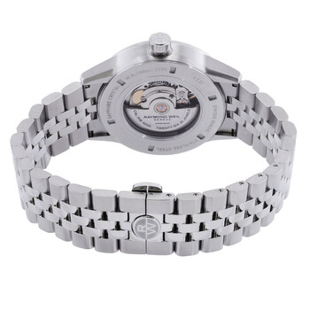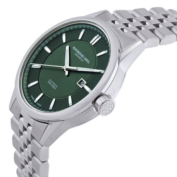 Silver-tone stainless steel case and bracelet. Fixed silver-tone stainless steel bezel. Green dial with silver-tone hands and index hour markers. Minute markers around the outer rim. Dial Type: Analog. Luminescent hands and markers. Date display at the 3 o'clock position. Automatic movement. Scratch resistant sapphire crystal. Round case shape, case size: 42 mm. Fold over clasp with a safety release. Water resistant at 100 meters / 330 feet. Functions: date, hour, minute, second. Freelancer Series. Casual watch style. Watch label: Swiss Made. Raymond Weil Freelancer Automatic Green Dial Men's Watch 2731-ST-52001.