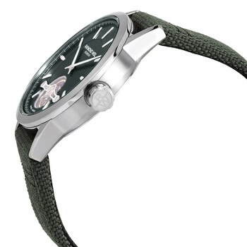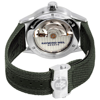 Stainless steel case with a green fabric strap. Fixed stainless steel bezel. Green (open heart) dial with luminous silver-tone hands and index hour markers. Minute markers around the outer rim. Dial Type: Analog. Luminescent hands. Raymond Weil calibre RW1212 automatic movement, containing 27 Jewels, bitting at 28800 vph, and has a power reserve of approximately 38 hours. Scratch resistant sapphire crystal. Screw down crown. Transparent case back. Round case shape. Case size: 42.5 mm. Case thickness: 10.6 mm. Folding clasp. Water resistant at 100 meters / 330 feet. Functions: hour, minute, second. Freelancer Series. Casual watch style. Watch label: Swiss Made. Raymond Weil Freelancer Automatic Green Dial Men's Watch 2780-STC-52001.