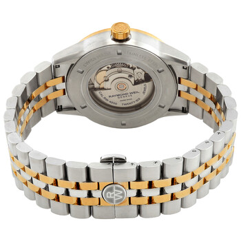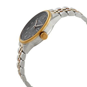 Stainless steel case with a two-tone (silver-tone and gold PVD) stainless steel bracelet. Fixed gold PVD stainless steel bezel. Grey dial with silver-tone hands and Arabic numeral hour markers. Arabic numeral minute markers (at 5 minute intervals). Dial Type: Analog. Date display at the 3 o'clock position. Automatic movement. Scratch resistant sapphire crystal. Round case shape, case size: 42.5 mm. Fold over clasp with a safety release. Water resistant at 50 meters / 165 feet. Functions: date, hour, minute, second. Freelancer Series. Dress watch style. Watch label: Swiss Made. Raymond Weil Freelancer Automatic Grey Dial Men's Watch 2734-STP-05600.