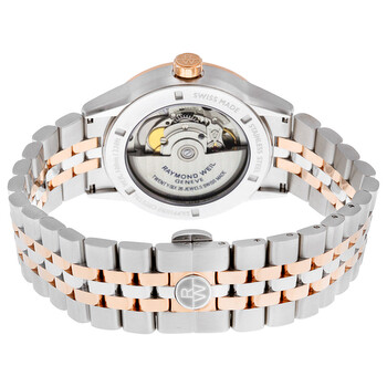 Stainless steel and case with a two-tone (silver and rose gold PVD) stainless steel bracelet. Fixed rose gold PVD bezel. Grey dial with luminous rose gold-tone hands and index hour markers. Minute markers around the outer rim. Dial Type: Analog. Luminescent hands and markers. Date display at the 3 o'clock position. Raymond Weil calibre RW 4200 automatic movement with a 38-hour power reserve. Scratch resistant sapphire crystal. Screw down crown. Transparent case back. Case size: 42 mm. Case thickness: 10 mm. Round case shape. Band width: 20 mm. Band length: 8.5 inches. Deployment clasp. Water resistant at 100 meters / 330 feet. Functions: date, hour, minute, second. Luxury watch style. Watch label: Swiss Made. Item Variations: 2740 SP5 60021, 2740.SP5.60021, 2740SP560021. Raymond Weil Freelancer Automatic Grey Dial Men's Watch 2740-SP5-60021.