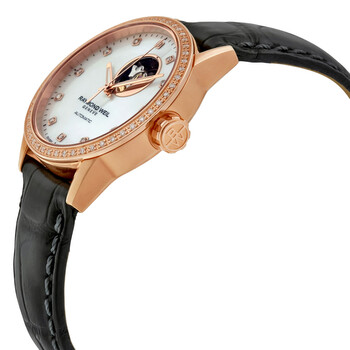 Rose gold PVD stainless steel case with a black leather strap. Fixed rose gold PVD bezel set with 50 diamonds. Mother of pearl dial with a skeletal window with luminous rose gold-tone hands and diamond hour markers. Minute markers around the outer rim. Dial Type: Analog. Automatic movement with a 38-hour power reserve. Scratch resistant sapphire crystal. Pull / push crown. Transparent case back. Case size: 29 mm. Case thickness: 8.85 mm. Round case shape. Fold over clasp with a push button release. Water resistant at 100 meters / 330 feet. Functions: hour, minute, second. Dress watch style. Item Variations: 2410 C5S 97085, 2410.C5S.97085, 2410C5S97085. Raymond Weil Freelancer Automatic Ladies Watch 2410-C5S-97085.