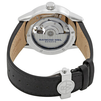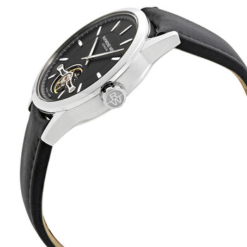 Silver-tone stainless steel case with a black (calfskin) leather strap. Fixed silver-tone stainless steel bezel. Black (open balance wheel) dial with luminous silver-tone hands and index hour markers. Dial Type: Analog. Luminescent hands and markers. Raymond Weil Calibre RW 1212 automatic movement with a 38-hour power reserve. Scratch resistant sapphire crystal. Screw down crown. Transparent case back. Round case shape, case size: 42.5 mm, case thickness: 10.6 mm. Fold over with push button release clasp. Water resistant at 100 meters / 330 feet. Functions: hour, minute. Dress watch style. Watch label: Swiss Made. Raymond Weil Freelancer Automatic Men's Leather Watch 2780-STC-20001.