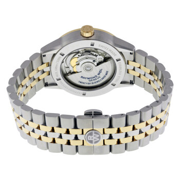 Stainless steel case with a two-tone (silver and yellow gold PVD) stainless steel bracelet. Fixed yellow gold PVD bezel. Silver dial with yellow gold-tone hands and index hour markers. Minute markers around the outer rim. Dial Type: Analog. Date display at the 3 o'clock position. Automatic movement with a 38-hour power reserve. Scratch resistant sapphire crystal. Screw down crown. Transparent case back. Case size: 42.5 mm. Case thickness: 10.3 mm. Round case shape. Push button deployment clasp. Water resistant at 100 meters / 330 feet. Functions: date, hour, minute, second. Casual watch style. Watch label: Swiss Made. Raymond Weil Freelancer Automatic Men's Watch 2740-STP-65021.