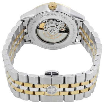 Stainless steel case with a two-tone (silver-tone and yellow gold PVD) stainless steel bracelet. Fixed yellow gold PVD bezel. Silver dial with luminous yellow gold-tone hands and index hour markers. Minute markers around the outer rim. Dial Type: Analog. Luminescent hands and markers. Date display at the 4 o'clock position. Automatic movement with a 38-hpour power reserve. Scratch resistant sapphire crystal. Screw downcrown. Transparent case back. Case size: 38 mm. Case thickness: 9.65 mm. Round case shape. Band width: 18 mm. Deployment clasp with a push button release. Water resistant at 100 meters / 330 feet. Functions: date, hour, minute, second. Additional Info: suitable for snorkeling, as well as swimming, but not diving. Dress watch style. Watch label: Swiss Made. Item Variations: 2770 STP 65001, 2770.STP.65001, 2770STP65001. Raymond Weil Freelancer Automatic Men's Watch 2770-STP-65001.