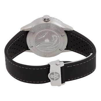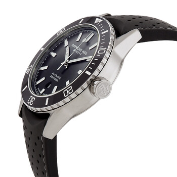 Silver-tone stainless steel case with a black rubber strap. Uni-directional rotating silver-tone stainless steel bezel. Gradient black dial with silver-tone hands and index hour markers. Minute markers around the outer rim. Dial Type: Analog. Luminescent hands and markers. Date display at the 6 o'clock position. Raymond Weil Calibre RW4200 automatic movement with a 38-hour power reserve. Scratch resistant sapphire crystal. Screw down crown. Solid case back. Round case shape, case size: 42.5 mm, case thickness: 11.7 mm. Fold over clasp with a safety release. Water resistant at 300 meters / 1000 feet. Freelancer Series. Dive watch style. Watch label: Swiss Made. Raymond Weil Freelancer Automatic Men's Watch 2775-SR1-20051.