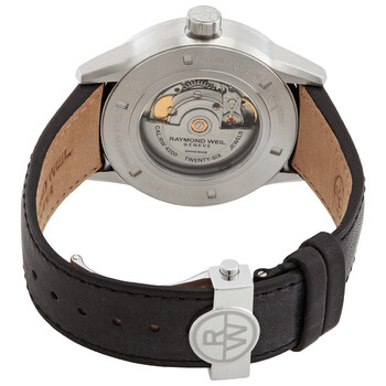 Silver-tone stainless steel case with a black leather strap. Fixed silver-tone stainless steel bezel. Silver dial with silver-tone hands and Arabic numeral hour markers. Arabic numeral minute markers (at 5 minute intervals). Dial Type: Analog. Date display at the 3 o'clock position. Automatic movement. Scratch resistant sapphire crystal. Round case shape, case size: 42.5 mm. Fold over clasp with a safety release. Water resistant at 50 meters / 165 feet. Functions: date, hour, minute, second. Freelancer Series. Dress watch style. Watch label: Swiss Made. Raymond Weil Freelancer Automatic Silver Dial Men's Watch 2734-STC-05650.