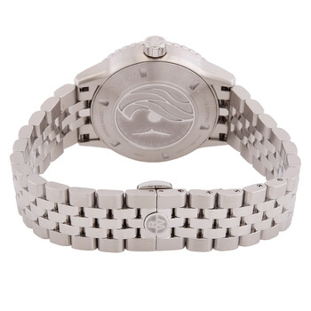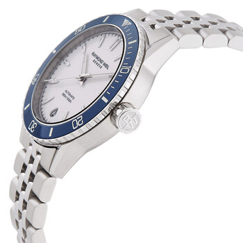Silver-tone stainless steel case and bracelet. Uni-directional rotating blue ceramic bezel. White dial with silver-tone hands and index hour markers. Minute markers around the outer rim. Dial Type: Analog. Luminescent hands and markers. Date display at the 6 o'clock position. Raymond Weil Calibre RW 4200 Automatic movement, based upon Sellita SW-200, containing 25 Jewels, bitting at 28800 vph, and has a power reserve of approximately 38 hours. Scratch resistant sapphire crystal. Screw down crown. Solid case back. Round case shape, case size: 36 mm, case thickness: 10.3 mm. Folding with double push-security system clasp. Water resistant at 300 meters / 1000 feet. Functions: date, hour, minute, second. Freelancer Series. Dive watch style. Watch label: Swiss Made. Raymond Weil Freelancer Automatic White Dial Ladies Watch 2755-ST3-30001.