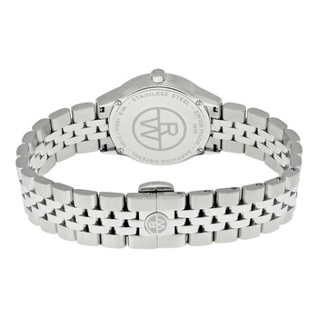 Stainless steel case with a stainless steel bracelet. Fixed stainless steel bezel. Black dial with luminous hands and diamond hour markers. Arabic numerals mark the 6 and 12 o'clock positions. Minute markers around the outer rim. Dial Type: Analog. Luminescent hands and markers. Date display at the 4 o'clock position. Quartz movement. Scratch resistant sapphire crystal. Pull / push crown. Solid case back. Case size: 29 mm. Case thickness: 6.55 mm. Round case shape. Deployment clasp. Water resistant at 100 meters / 330 feet. Functions: date, hour, minute, second. Dress watch style. Watch label: Swiss Made. Item Variations: 5670 ST 05645, 5670.ST.05645, 5670ST05645. Raymond Weil Freelancer Black Dial Ladies Watch 5670-ST-05645.