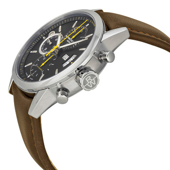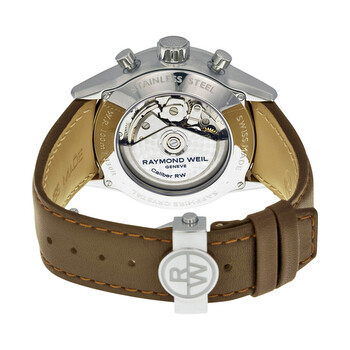 Stainless steel case with a brown leather strap. Fixed stainless steel bezel. Black dial with luminous silver-tone hands and index hour markers. Tachymeter markings around the outer rim. Dial Type: Analog. Luminescent hands and markers. Day of the week and date display at the 3 o'clock position. Chronograph - three sub-dials displaying: 60 second, 30 minute and 12 hour. Raymond Weil calibre RW 5000 automatic movement with a 46-hour power reserve. Scratch resistant sapphire crystal. Pull / push crown. Transparent case back. Case size: 42 mm. Case thickness: 13.7 mm. Round case shape. Band width: 20 mm. Fold over clasp with with a push button release Water resistant at 100 meters / 330 feet. Functions: chronograph, date, day, hour, minute, second. Luxury watch style. Watch label: Swiss Made.Raymond Weil Freelancer Black Dial Men's Watch 7730-STC-20021.