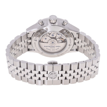 Silver-tone stainless steel case and bracelet. Fixed green ceramic bezel. Green dial with silver-tone hands and index hour markers. Minute markers around the outer rim. Dial Type: Analog. Luminescent hands and markers. Chronograph - three sub-dials displaying: 60 second, 30 minute and 12 hour. Automatic movement. Scratch resistant sapphire crystal. Screw down crown. Round case shape, case size: 43.5 mm. Fold over clasp with a safety release. Functions: chronograph, hour, minute, second. Freelancer Series. Casual watch style. Watch label: Swiss Made. Raymond Weil Freelancer Chronograph Automatic Green Dial Men's Watch 7741-ST7-52021.