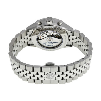 Stainless steel case with a stainless steel bracelet. Fixed stainless steel bezel. Black dial with lumuinous silver-tone hands and index hour markers. Tachymeter scale appears around the outer rim. Dial Type: Analog. Day of the week and date display at the 3 position. Chronograph - three sub-dials displaying: 60 second, 30 minute and 12 hour. Automatic movement with a 46-hour power reserve. Scratch resistant sapphire crystal. Transparent case back. Case diameter: 42 mm. Case thickness: 13.7 mm. Round case shape. Bracelet width: 22 mm. Push button fold over clasp. Water resistant at 100 meters / 330 feet. Functions: chronograph, day of the week, date, hour, minute, second. Dress watch style. Watch label: Swiss Made. Raymond Weil Freelancer Black Dial Chronograph Stainless Steel Automatic Men's Watch 7730-ST-20041.