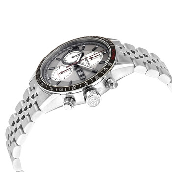 Stainless steel case with a stainless steel bracelet. Fixed stainless steel bezel with a black PVD ring showing tachymeter markings. Silver dial with luminous black hands and index hour markers. Minute markers around the outer rim. Dial Type: Analog. Luminescent hands and markers. Day of the week and date display at the 3 o'clock position. Chronograph - three sub-dials displaying: 60 second, 30 minute and 12 hour. Raymond Weil calibre RW 5000 automatic movement, based upon ETA-Valjoux Caliber 7750, containing 25 Jewels, bitting at 28800 vph, and has a power reserve of approximately 46 hours. Scratch resistant sapphire crystal. Screw down crown. Solid case back. Round case shape. Case size: 42 mm. Case thickness: 13.85 mm. Band width: 22 mm. Fold over clasp with a double push-security system. Water resistant at 100 meters / 330 feet. Functions: chronograph, date, day, hour, minute, second. Freelancer Series. Luxury watch style. Watch label: Swiss Made. Raymond Weil Freelancer Chronograph Automatic Silver Dial Men's Watch 7731-ST1-65421.