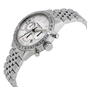 Stainless steel case with a stainless steel bracelet. Fixed stainless steel bezel showing tachymeter markings. White dial with luminous silver-tone hands and index hour markers. Minute markers around the outer rim. Dial Type: Analog. Luminescent hands and markers. Date display between 4 and 5 o'clock position. Chronograph - three sub-dials displaying: 60 second, 30 minute and 12 hours. Automatic movement with a 46-hour power reserve. Scratch resistant sapphire crystal. Screw down crown. Transparent case back. Round case shape. Case size: 43 mm. Case thickness: 13.7 mm. Butterfly clasp. Water resistant at 100 meters / 330 feet. Functions: chronograph, date, hour, minute, second. Dress watch style. Watch label: Swiss Made. Raymond Weil Freelancer Chronograph Automatic White Dial Men's Watch 7740-ST-30001.