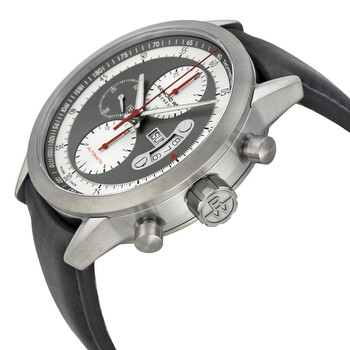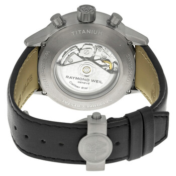Titanium case with a black leather strap. Fixed titanium bezel. Grey and silver dial with luminous silver-tone hands and index hour markers. Minute markers. Tachymeter around the outer rim. Dial Type: Analog. Luminescent hands. Day of the week and date display at the 3 o'clock position. Chronograph - three sub-dials displaying: 60 second, 30 minute and 12 hour. Caliber RW 5000 automatic movement with a 46-hour power reserve. Scratch resistant sapphire crystal. Pull / push crown. Transparent case back. Round case shape. Case size: 45 mm. Case thickness: 14 mm. Band width: 22 mm. Band length: 7 inches. Deployment clasp. Water resistant at 100 meters / 330 feet. Functions: chronograph, tachymeter, date, day, hour, minute, second. Luxury watch style. Watch label: Swiss Made. Item Variations: 7745 TIC 05659, 7745.TIC.05659, 7745TIC05659. Raymond Weil Freelancer Chronograph Men's Watch 7745-TIC-05659.