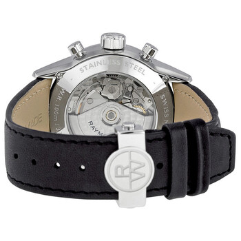 Stainless steel case with a black leather strap. Fixed bezel. Silver dial with silver-tone hands and stick hour markers. Minute markers around the outer rim. Dial Type: Analog. Luminescent hands and markers. Day and date display appears at the 3 o'clock position. Two sub-dials displaying: 30 minute and 12 hour. Automatic movement. Scratch resistant sapphire crystal. Screw down crown. Solid case back. Case diameter: 42 mm. Case thickness: 13.7 mm. Round case shape. Tang clasp. Water resistant at 100 meters / 330 feet. Functions: date, day, hour, minute, second. Luxury watch style. Watch label: Swiss Made.
