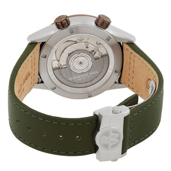 Silver-tone stainless steel with bronze case with a green leather strap. Fixed bronze stainless steel with bronze bezel. Gradient green dial with silver-tone hands and index hour markers. Minute markers around the outer rim. Dial Type: Analog. Luminescent hands and markers. Date display at the 6 o'clock position. Raymond Weil Calibre RW3230 automatic movement with a 50-hour power reserve. Scratch resistant sapphire crystal. Screw down crown. Transparent see through case back. Round case shape, case size: 40.5 mm, case thickness: 9.7 mm. Fold over clasp with a safety release. Water resistant at 100 meters / 330 feet. Functions: GMT, second time zone, hour, minute, second. Freelancer Series. Raymond Weil Freelancer GMT Worldtimer Automatic Men's Watch 2765-SBC-52001.