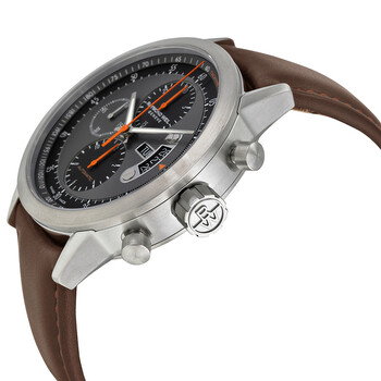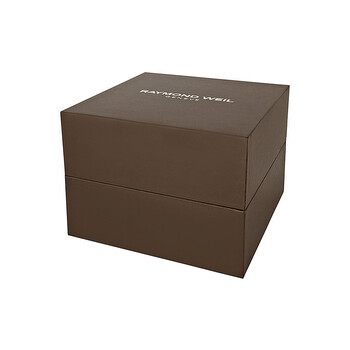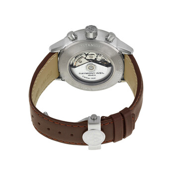 Titanium case with a brown leather strap. Fixed titanium bezel. Grey and black dial with luminous silver-tone hands and index hour markers. Minute markers. Tachymeter around the outer rim. Dial Type: Analog. Day of the week and date display at the 3 o'clock position. Chronograph - three sub-dials displaying: 60 second, 30 minute and 12 hour. Automatic movement with a 46-hour power reserve. Scratch resistant sapphire crystal. Pull / push crown. Skeleton case back. Case diameter: 45 mm. Case thickness: 13.7 mm. Round case shape. Band width: 27 mm. Band length: 9 inches. Tang clasp. Water resistant at 100 meters / 330 feet. Functions: chronograph, tachymeter, date, hour, minute, second. Dress watch style. Raymond Weil Freelancer Grey and Black Dial Brown Leather Men's Watch 7745-TIC-05609.