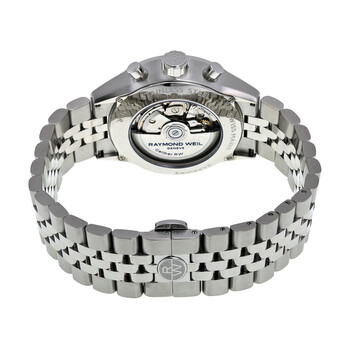 Stainless steel case with a stainless steel bracelet. Fixed stainless steel bezel. Ivory dial with luminous hands and index hour markers. Tachymeter scale appears around the outer rim. Dial Type: Analog. Luminescent hands and markers. Day of the week and date display at the 3 o'clock position. Chronograph - three sub-dials displaying: 60 second, 30 minute and 12 hour. Mechanical movement. Scratch resistant sapphire crystal. Pull / push crown. Skeleton case back. Case diameter: 42 mm. Case thickness: 13.7 mm. Round case shape. Bracelet width: 22 mm. Double push button fold over clasp. Water resistant at 100 meters / 330 feet. Functions: hour, minute, second, date, chronograph, tachymeter. Luxury watch style. Watch label: Swiss Made. Raymond Weil Freelancer Ivory Dial Stainless Steel Men's Watch 7730-ST-65025.
