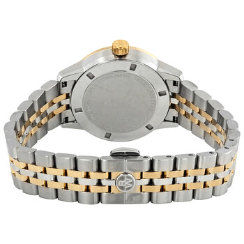 Stainless steel case with a two-tone (silver-tone and gold PVD) stainless steel bracelet. Fixed gold PVD bezel. Mother of pearl dial with luminous gold-tone hands and index hour markers. Minute markers around the outer rim. Dial Type: Analog. Luminescent hands and markers. Date display at the 3 o'clock position. Quartz movement. Scratch resistant sapphire crystal. Screw down crown. Solid case back. Round case shape. Case size: 34 mm. Case thickness: 8.3 mm. Fold over clasp with a push button release. Water resistant at 100 meters / 330 feet. Functions: date, hour, minute, second. Casual watch style. Watch label: Swiss Made. Raymond Weil Freelancer Mother of Pearl Dial Ladies Two Tone Watch 5634-STP-97021.
