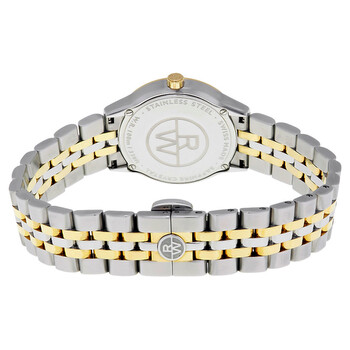 Stainless steel case with a two-tone (silver and yellow gold-tone) stainless steel bracelet. Fixed yellow gold-tone bezel. Mother of pearl dial with luminous yellow gold-tone hands and diamond-set index hour markers. Arabic numerals mark the 6 and 12 o'clock positions. Minute markers around the outer rim. Dial Type: Analog. Luminescent hands. Date display at the 4 o'clock position. Quartz movement. Scratch resistant sapphire crystal. Pull / push crown. Solid case back. Case size: 29 mm. Case thickness: 6.55 mm. Round case shape. Deployment clasp. Water resistant at 100 meters / 330 feet. Functions: date, hour, minute, second. Dress watch style. Watch label: Swiss Made. Item Variations: 5670 STP 05985, 5670.STP.05985, 5670STP05985. Raymond Weil Freelancer Mother of Pearl Dial Ladies Watch 5670-STP-05985.