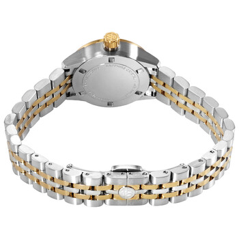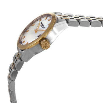 Stainless steel case with a two-tone (silver-tone and yellow gold PVD ) stainless steel bracelet. Fixed yellow gold PVD bezel. Mother of pearl dial with luminous yellow gold-tone hands and diamond hour markers. Minute markers around the outer rim. Dial Type: Analog. Luminescent hands. Date display at the 3 o'clock position. Quartz movement. Scratch resistant sapphire crystal. Pull / push crown. Solid case back. Round case shape. Case size: 26 mm. Fold over clasp with a push button release. Water resistant at 100 meters / 330 feet. Functions: date, hour, minute. Freelancer Series. Dress watch style. Watch label: Swiss Made. Raymond Weil Freelancer Quartz Diamond Ladies Watch 5626-STP-97081.