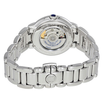 Stainless steel case with a stainless steel bracelet. Fixed stainless steel bezel. Silver dial with blue hands and Roman numeral hour markers. Dial Type: Analog. Date display at the 3 o'clock position. Automatic movement with a 38- hour power reserve. Scratch resistant sapphire crystal. Pull / push crown with a blue lacquered insert. Skeleton case back. Case diameter: 35 mm. Round case shape. Band width: 20.3 mm. Band length: 8 inches. Hidden folding clasp. Water resistant at 50 meters / 165 feet. Functions: date, hour, minute, second. Casual watch style. Watch label: Swiss Made. Raymond Weil Jasmine Automatic Silver Dial Watch 2935-ST-01659.