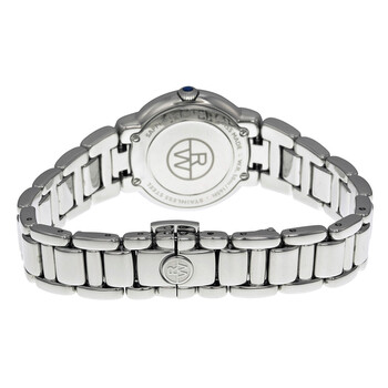 Stainless steel case with a stainless steel bracelet. Fixed stainless steel bezel set with 28 diamonds. Silver dial with blue hands and Roman numeral hour markers. Minute markers around an inner ring. Dial Type: Analog. Date display at the 3 o'clock position. Quartz movement. Scratch resistant sapphire crystal. Cabochon crown. Solid case back. Case diameter: 29 mm. Case thickness: 7 mm. Round case shape. Band width: 14 mm. Fold over clasp with a safety release. Water resistant at 50 meters / 165 feet. Functions: date, hour, minute, second. Dress watch style. Watch label: Swiss Made. Raymond Weil Jasmine Diamond Silver Dial Stainless Steel Ladies Watch 5229-STS-00659.
