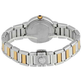 Silver-tone stainless steel case with a two-tone (silver-tone and yellow gold-tone) stainless steel bracelet. Fixed yellow gold-tone bezel with diamond set. Silver dial with yellow gold-tone hands and alternating Roman numeral and diamond hour markers. Minute markers around an inner ring. Dial Type: Analog. Date display at the 3 o'clock position. Quartz movement. Scratch resistant sapphire crystal. Pull / push crown. Solid case back. Round case shape, case size: 30 mm. Fold over clasp with a push button release. Water resistant at 50 meters / 165 feet. Functions: date, hour, minute. Jasmine Series. Dress watch style. Watch label: Swiss Made. Raymond Weil Jasmine Quartz Diamond Silver Dial Ladies Watch 5240-SPS-00665.